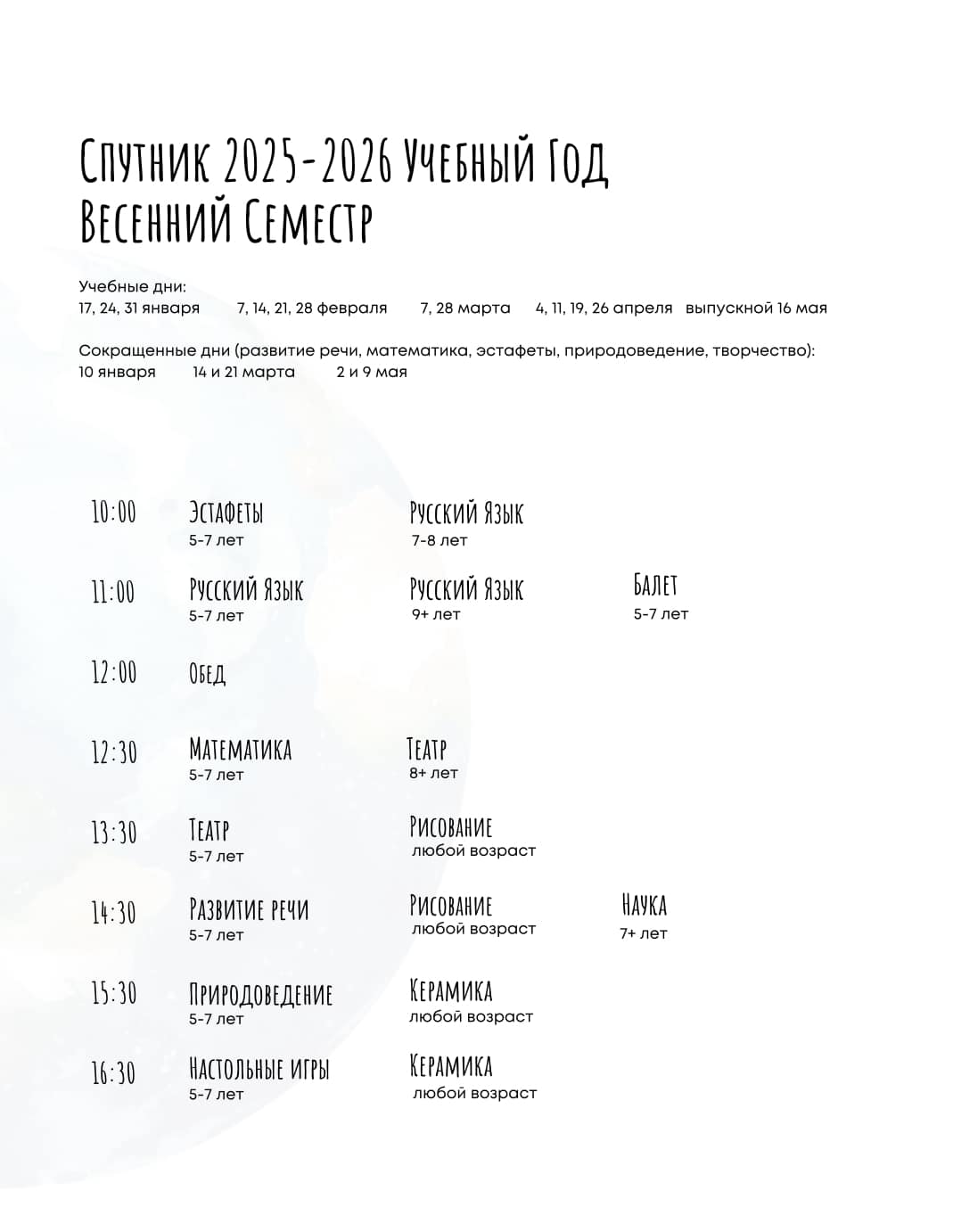 Расписание школы Спутник: Весенний семестр 2025