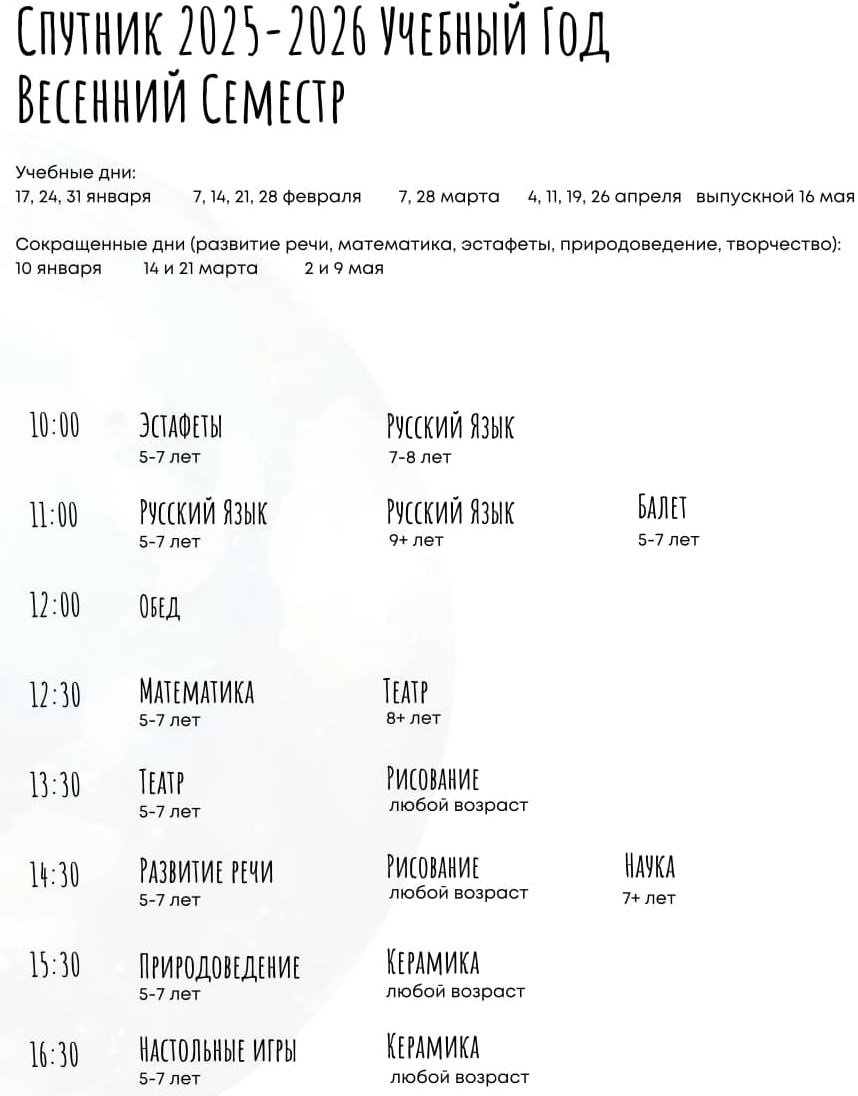 Занятия в школе «Спутник» проходят каждую субботу с 10:00 до 17:00 (10 am — 5 pm) на русском языке. Мы предоставляем классы для детей: русский, чтение, балет, творчество, наука, робототехника, театр, рисование, шахматы и спортивные классы (футбол, тхэквондо, хоккей на траве). А так же классы и клубы для взрослых: йога, английский, книжный клуб, бизнес/IT клуб. В школе преподают как профессиональные учителя, так и волонтёры. Мы всегда рады сотрудничеству и дружбе с талантливыми представителями нашего русского комьюнити. В программе классы на русском языке – академические и творческие. Также проводятся выставки картин, поделок, обмен книгами (book club), театральные постановки, концерты и другие культурные события. Каждую неделю собираются несколько десятков семей для физического общения, обучению языкам, реализации творческих проектов. У нас можно встретить настоящую дружбу и поддержку!
